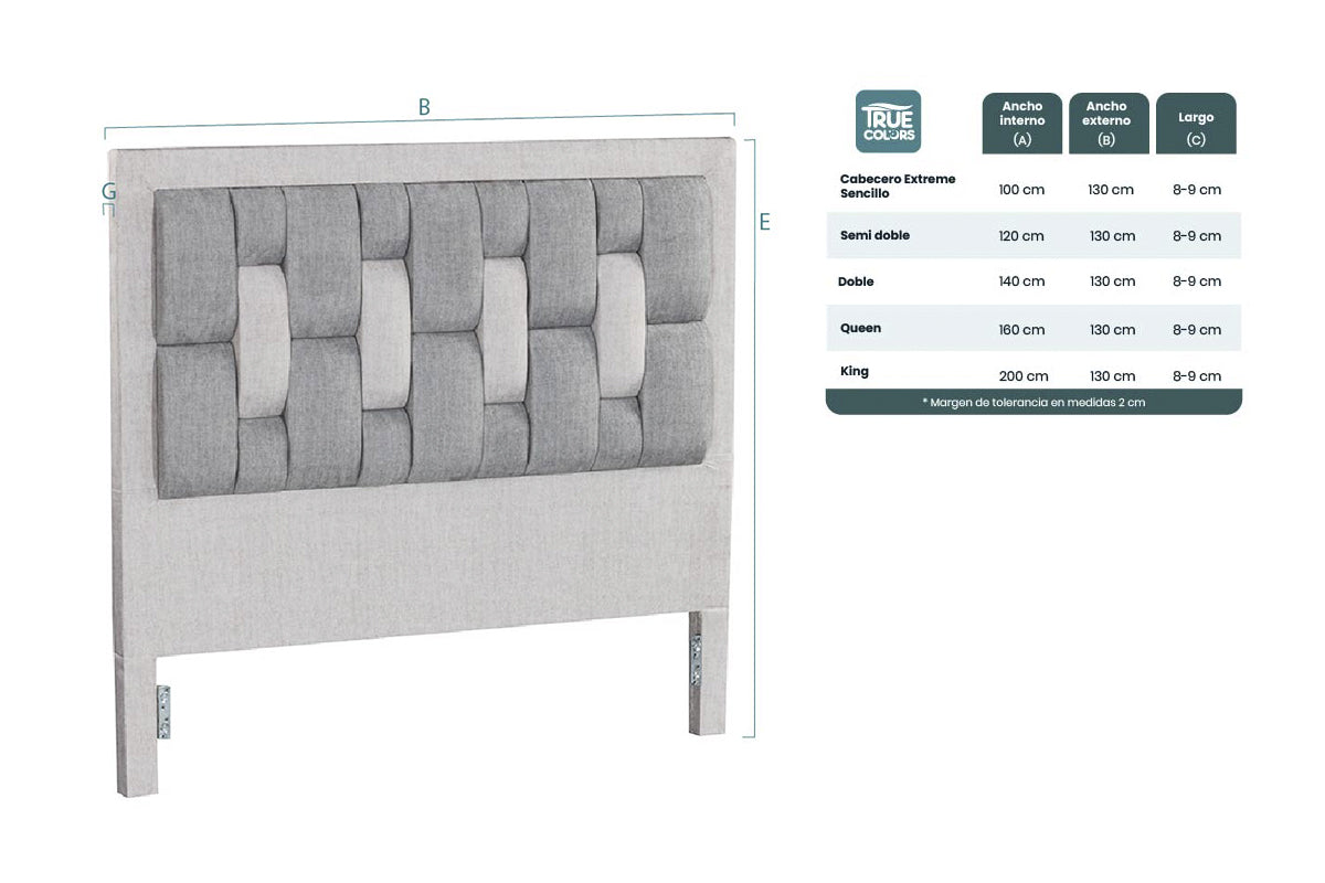| Peso de producto | 100X130 = 15 kg, 120x130 = 16 kg, 140x130 = 17 kg, 160x130 = 18 kg, 200x130 =21 kg |