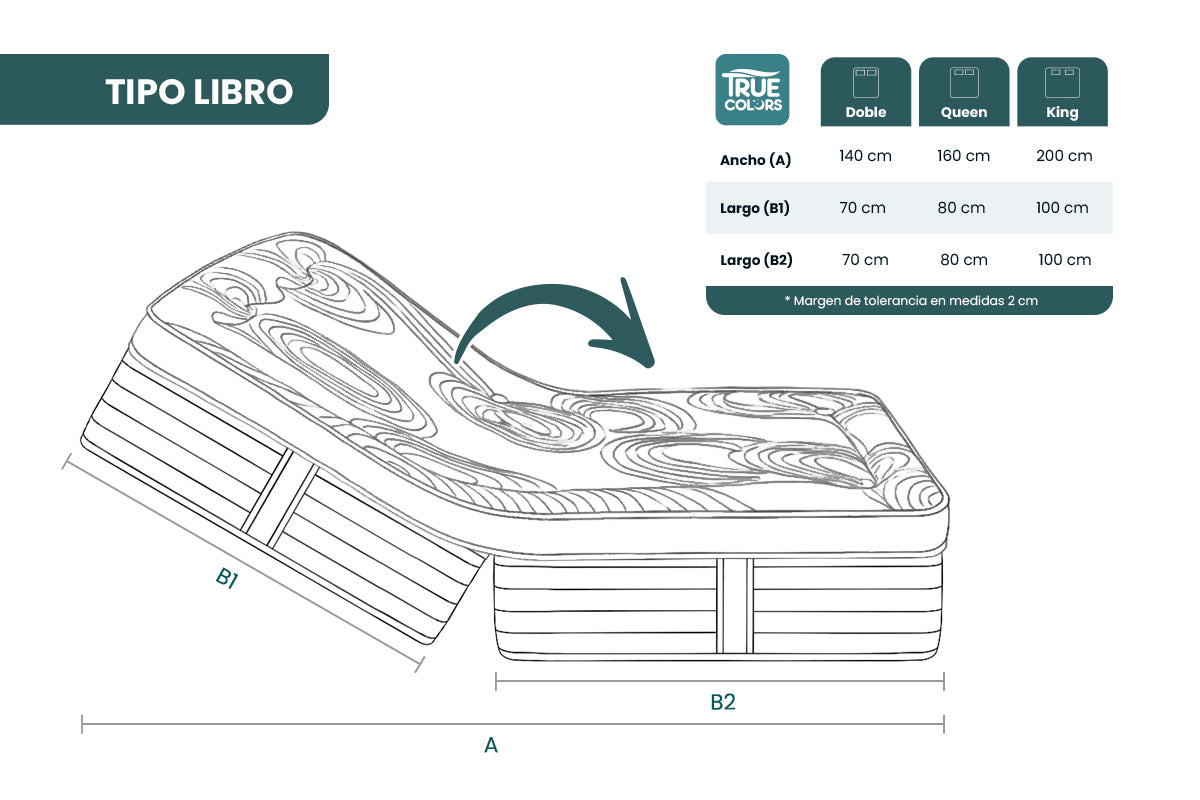 | Peso de producto | 100X190 = 37 kg, 120x190 = 44 kg, 140x190 = 51 kg, 160x190 = 60 kg, 200x200 = 70 kg |
