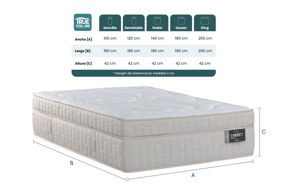 | Peso de producto | 100X190 = 49 kg, 120x190 = 59 kg, 140x190 = 69 kg, 160x190 = 81 kg, 200x200 = 95 kg |